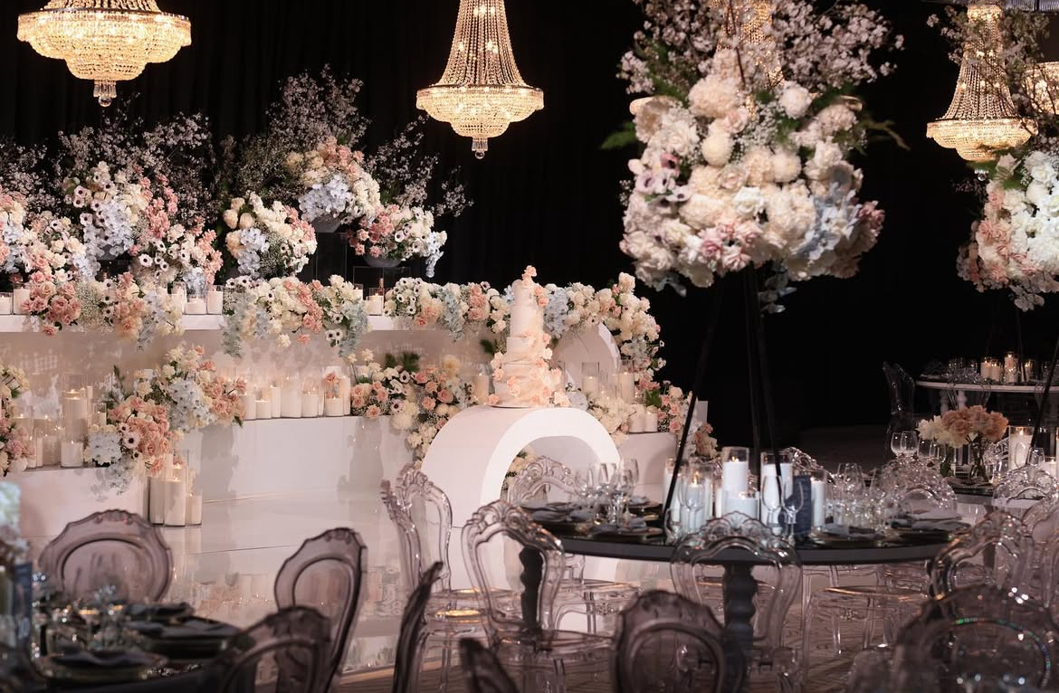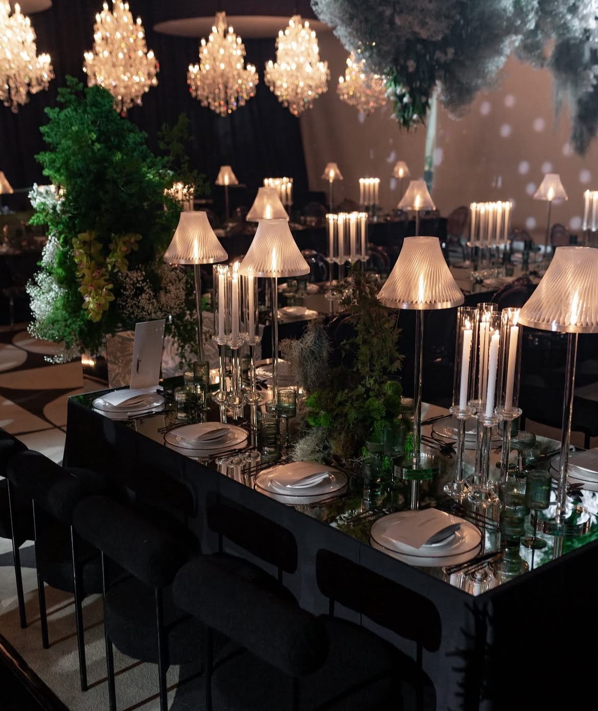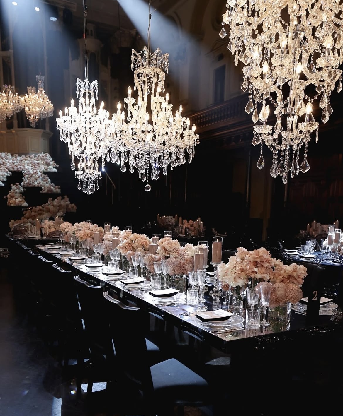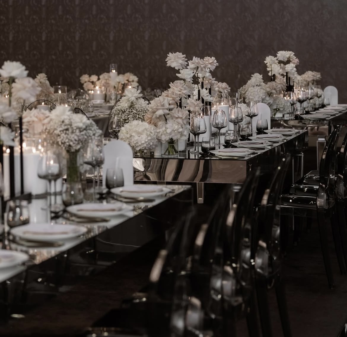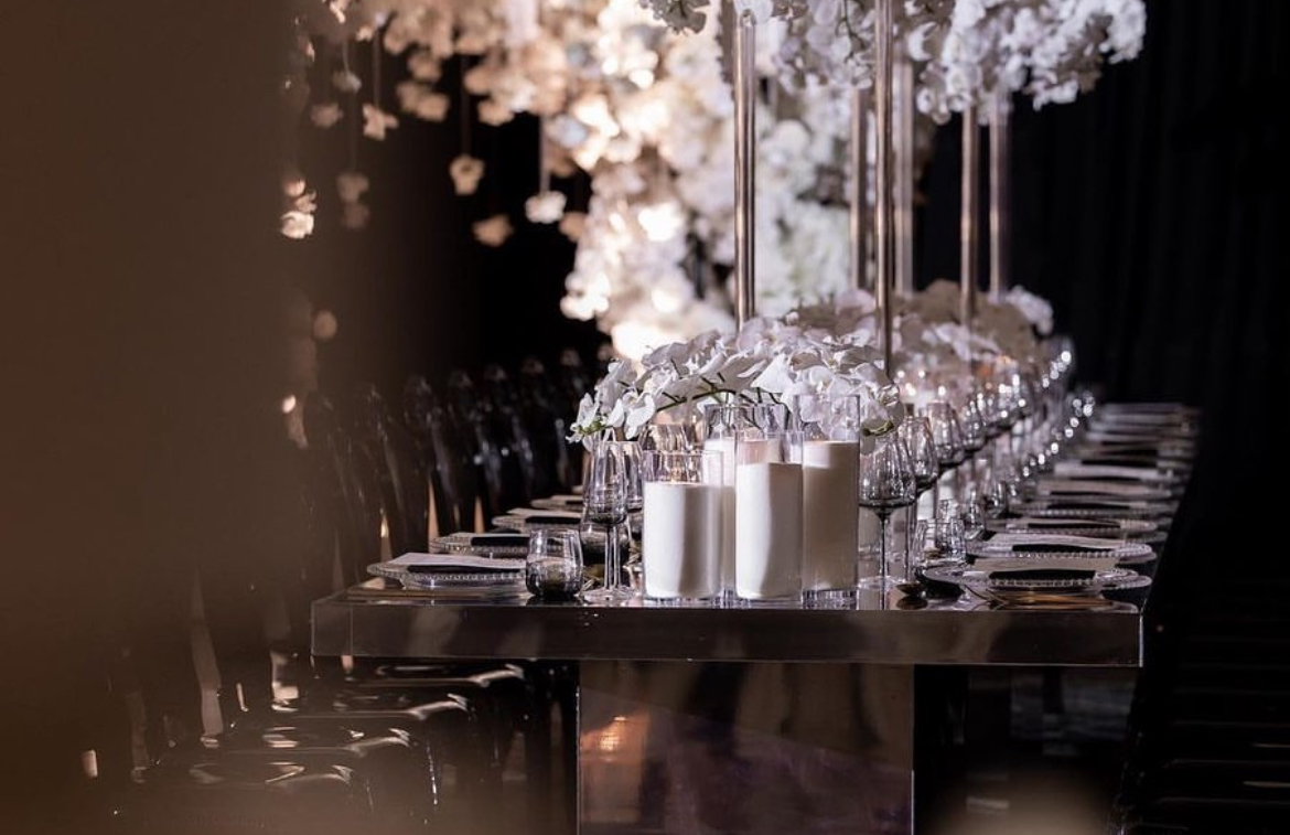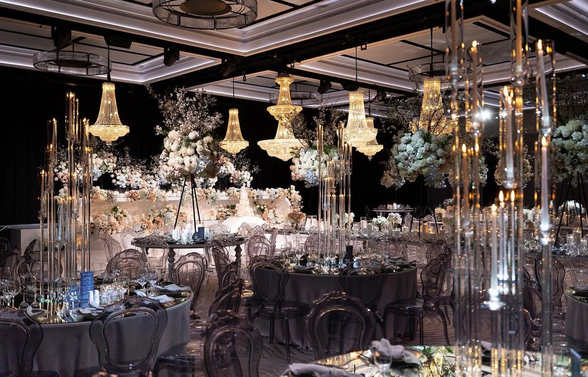 Expect glittering crystal chandeliers, ornate candelabras, and lavish floral arrangements in full bloom. Statement tables with mirrored or bold finishes are styled to perfection with elegant charger plates, sparkling cutlery, and crystal-cut glassware, creating a visually striking tablescape.