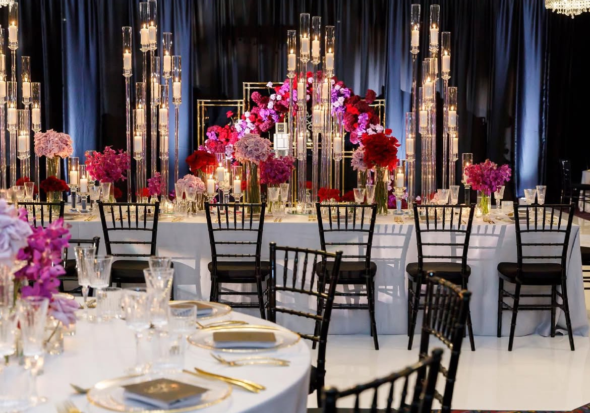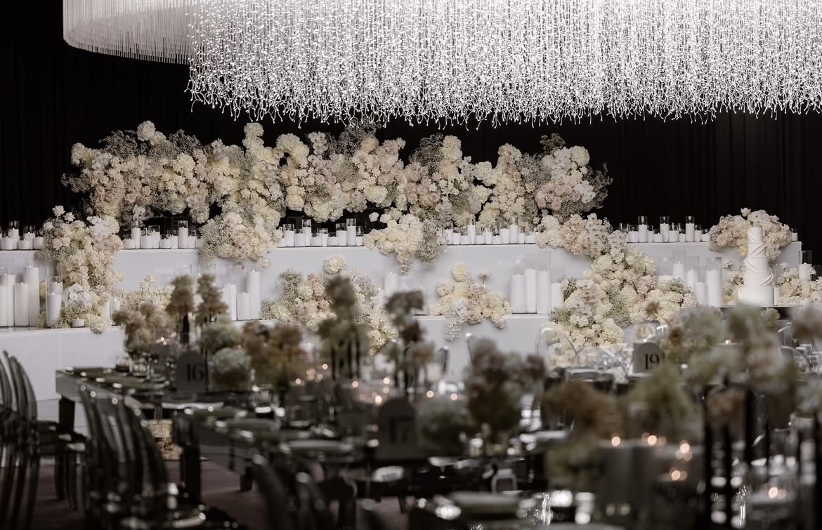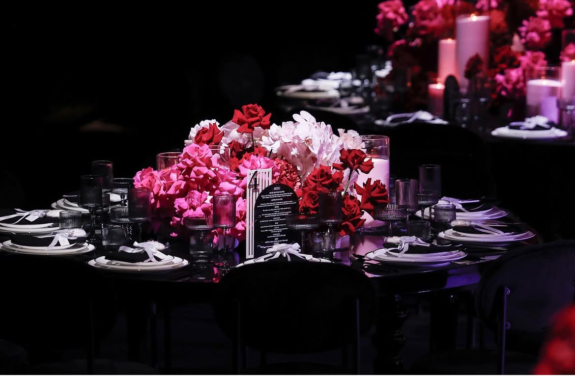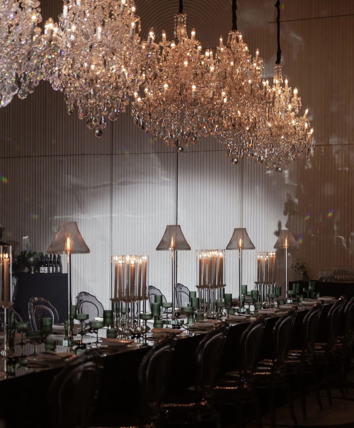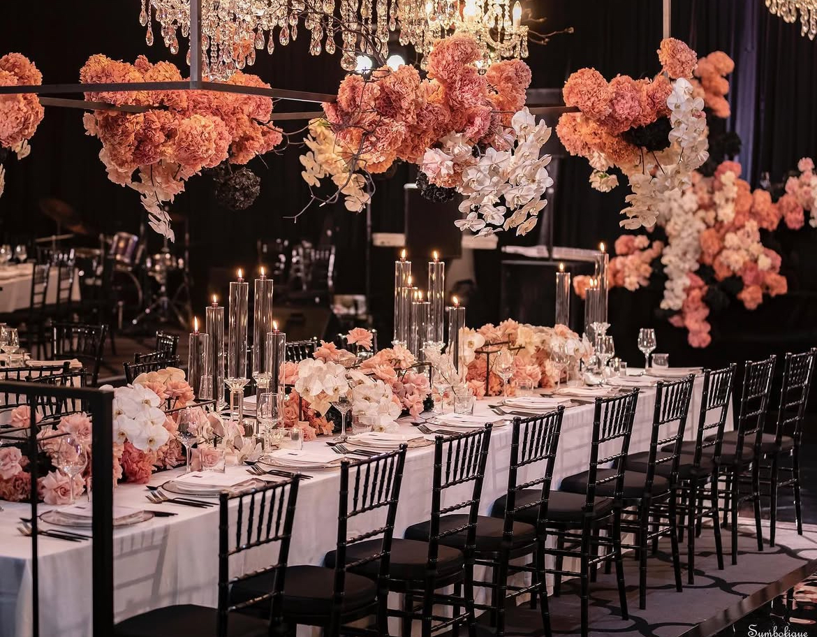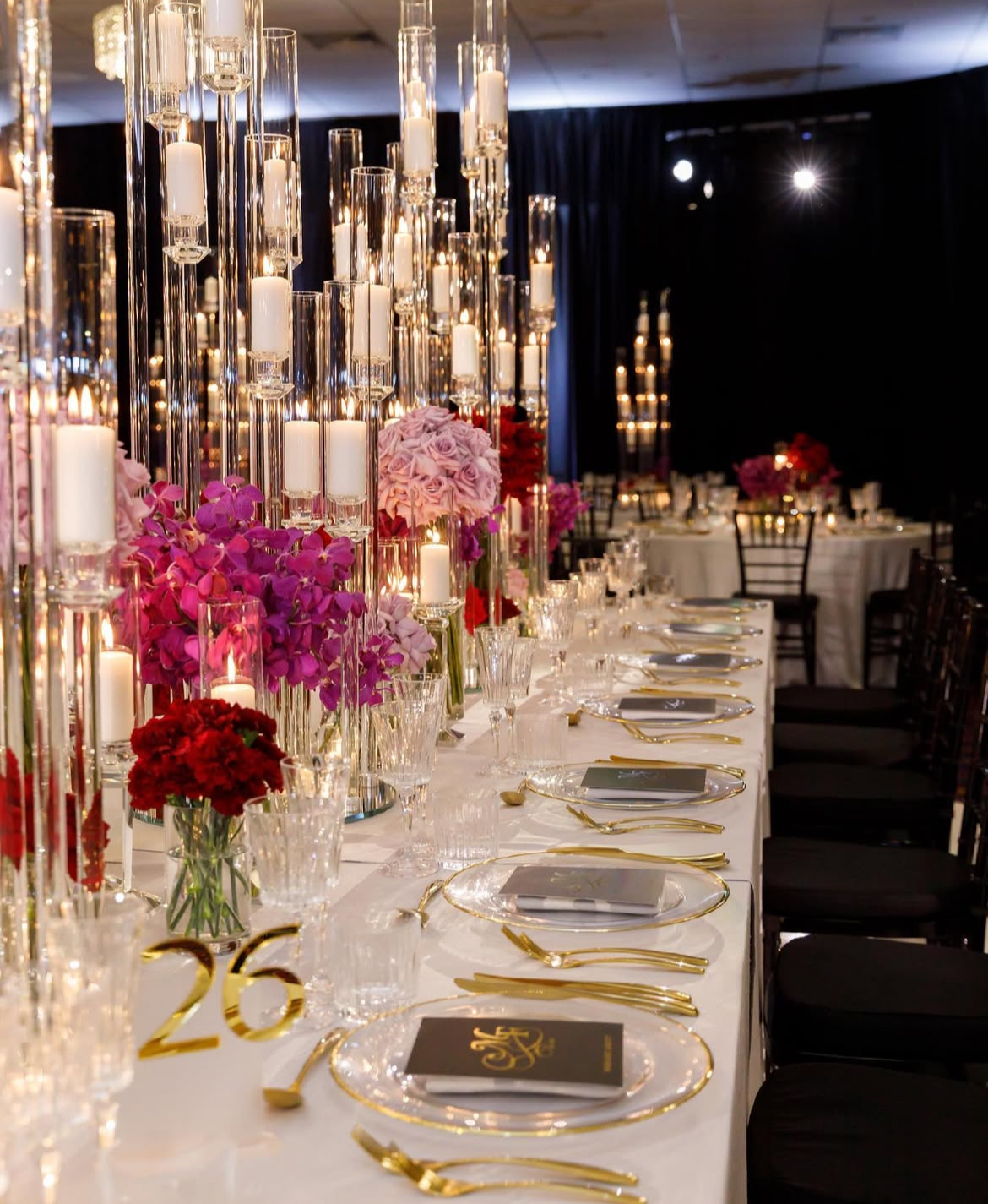 Expect glittering crystal chandeliers, ornate candelabras, and lavish floral arrangements in full bloom. Statement tables with mirrored or bold finishes are styled to perfection with elegant charger plates, sparkling cutlery, and crystal-cut glassware, creating a visually striking tablescape.
