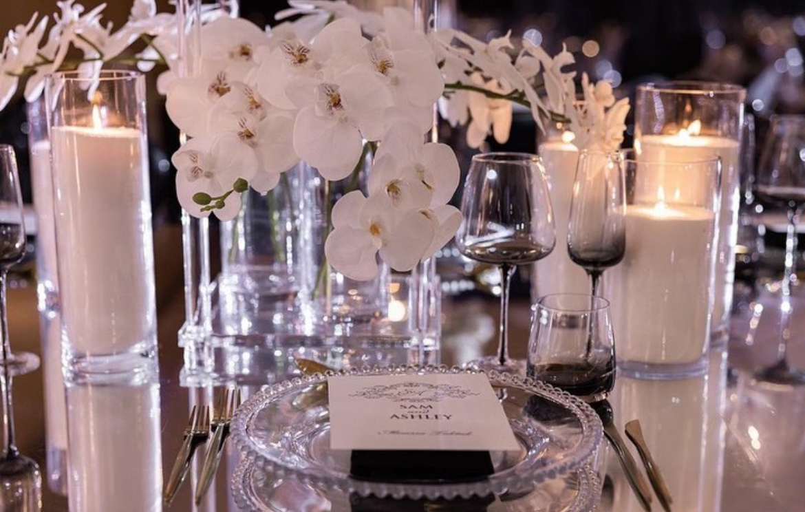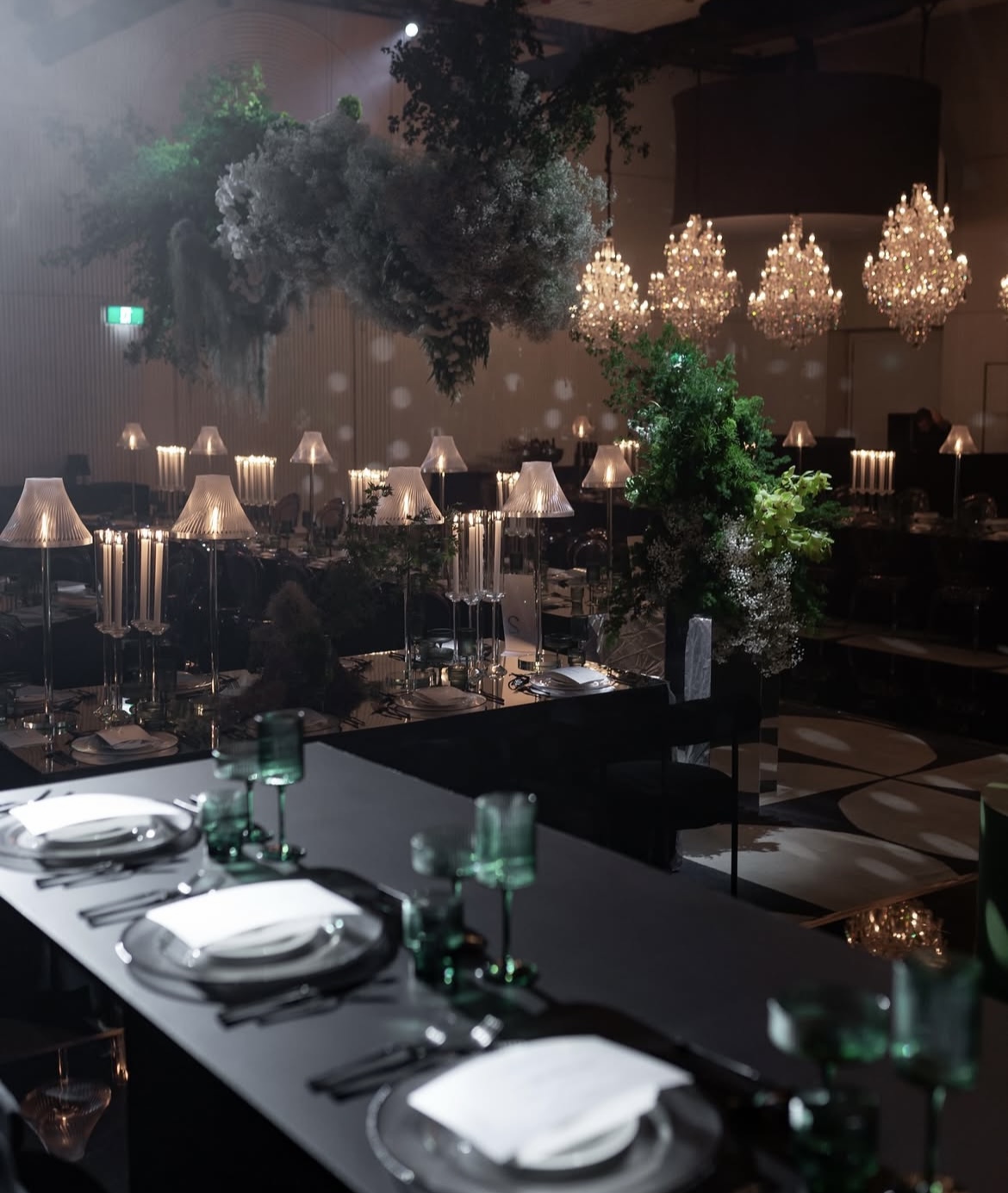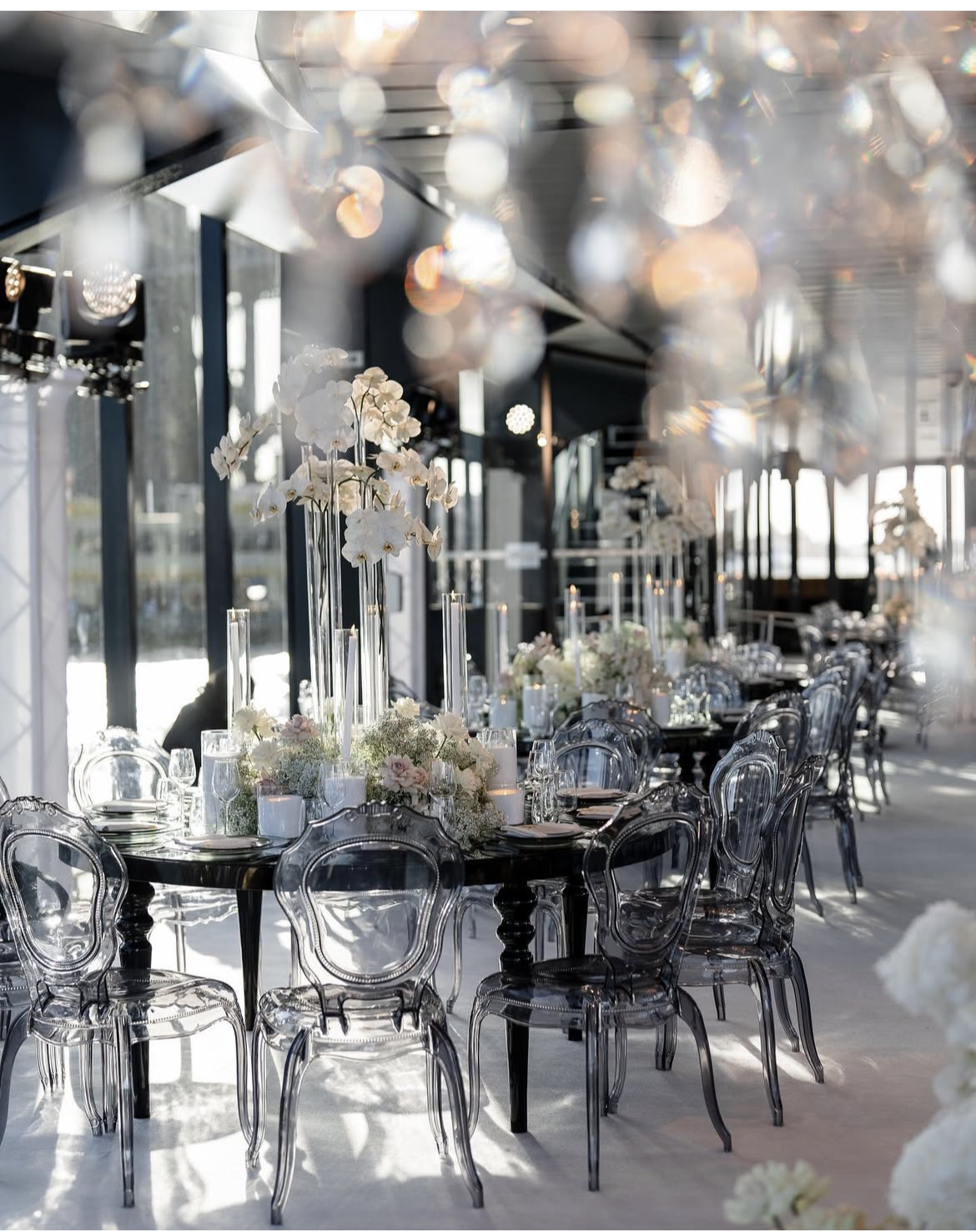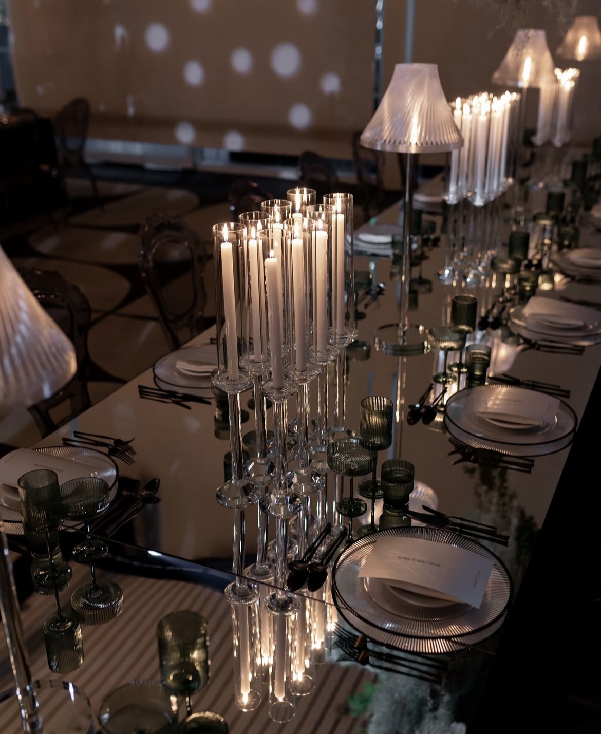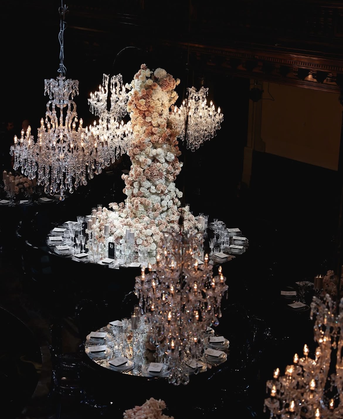 Expect glittering crystal chandeliers, ornate candelabras, and lavish floral arrangements in full bloom. Statement tables with mirrored or bold finishes are styled to perfection with elegant charger plates, sparkling cutlery, and crystal-cut glassware, creating a visually striking tablescape.