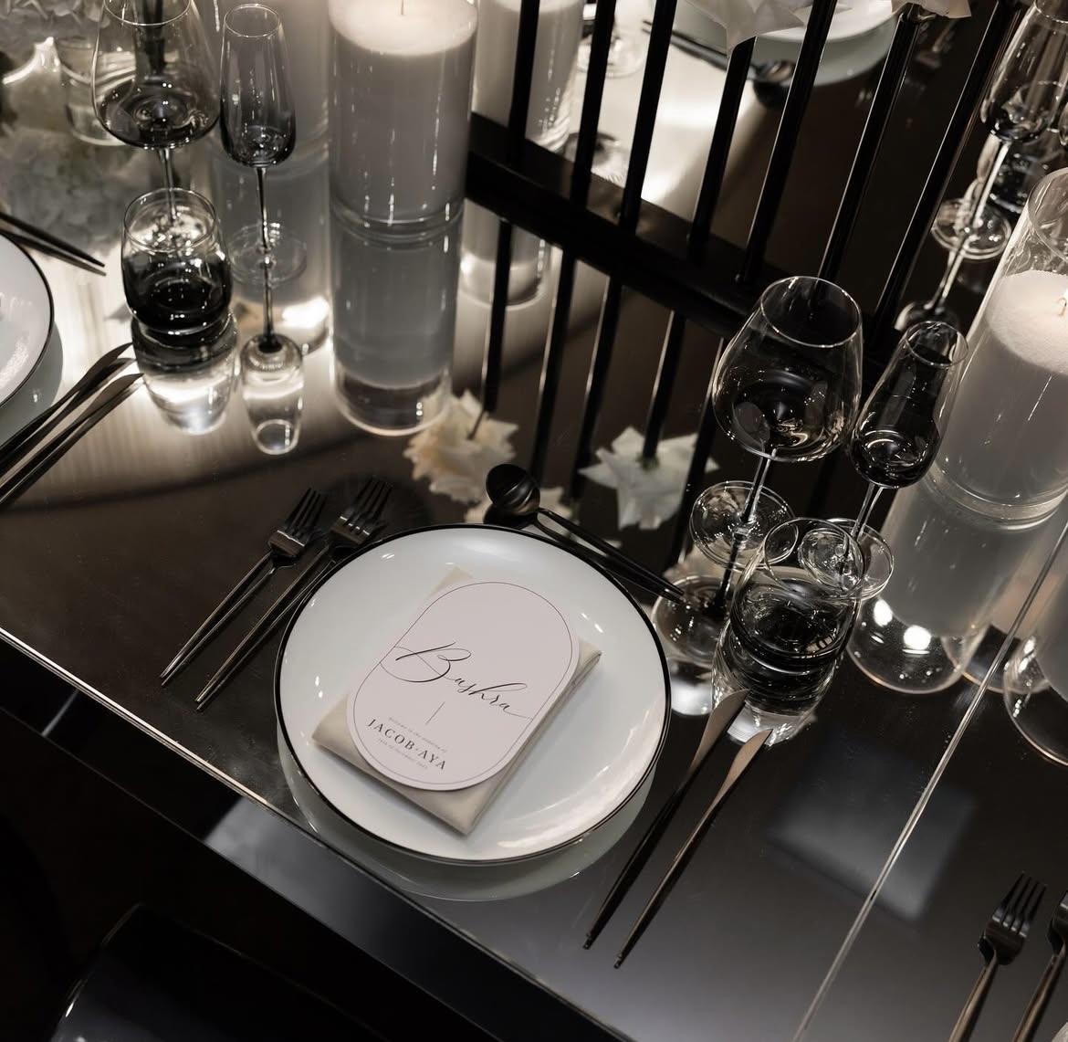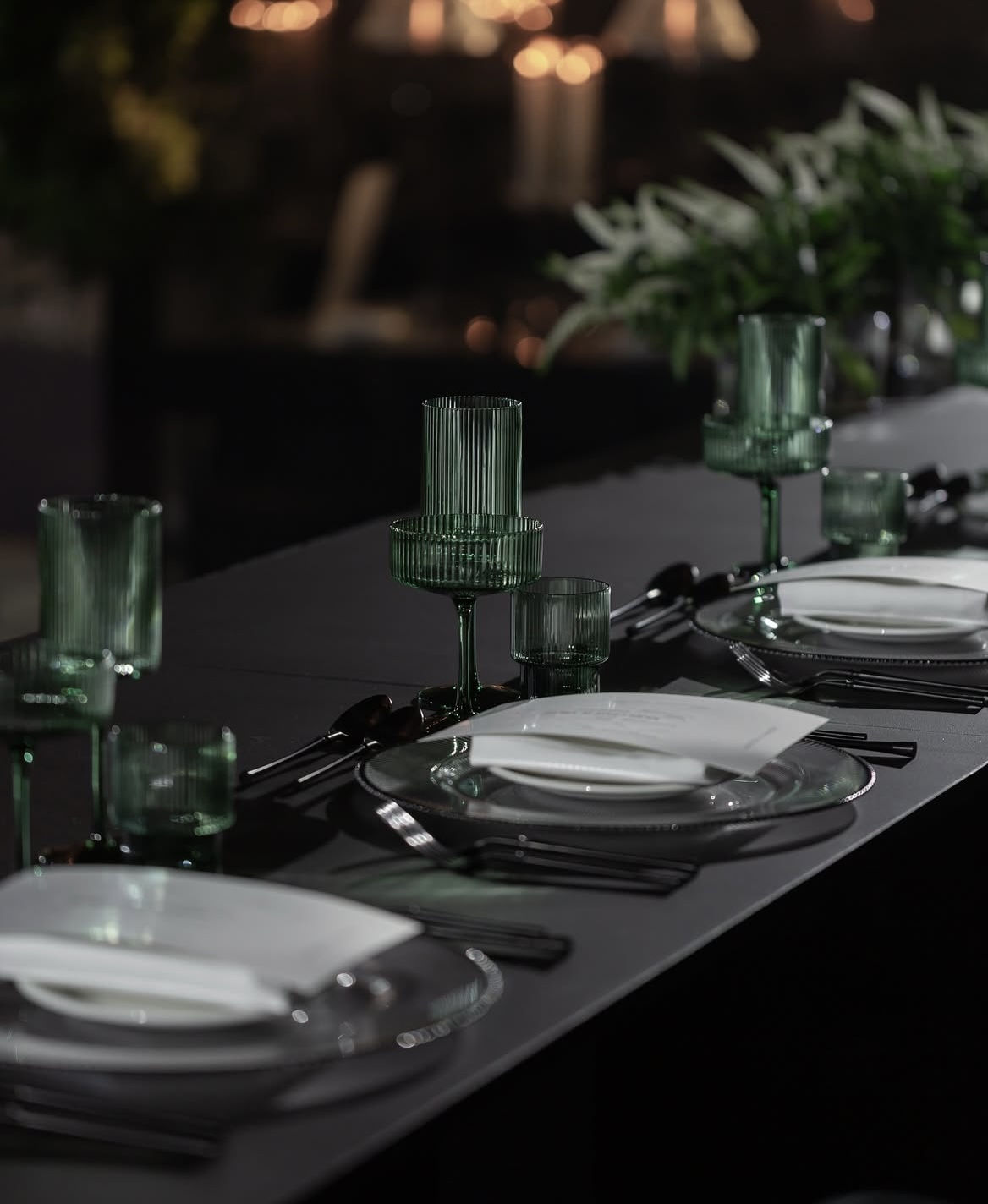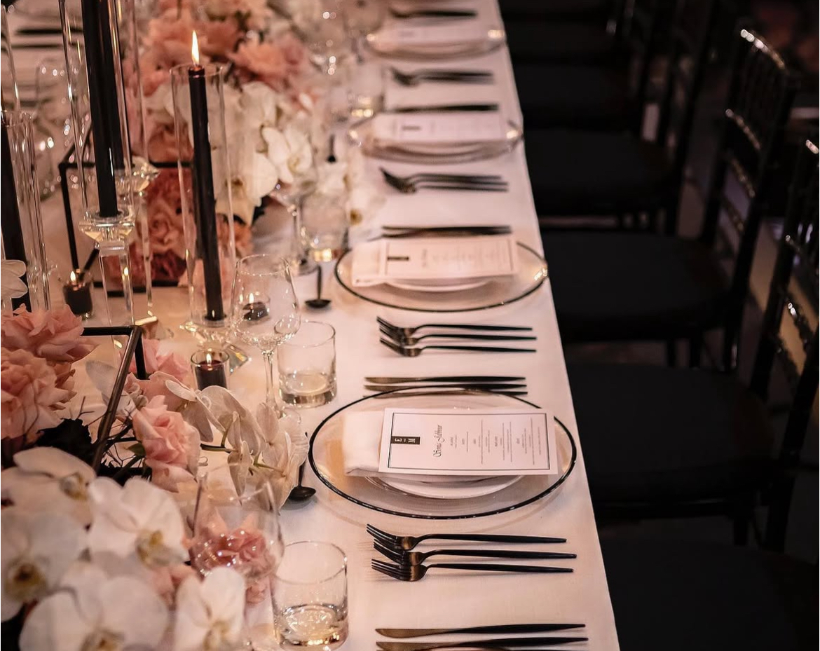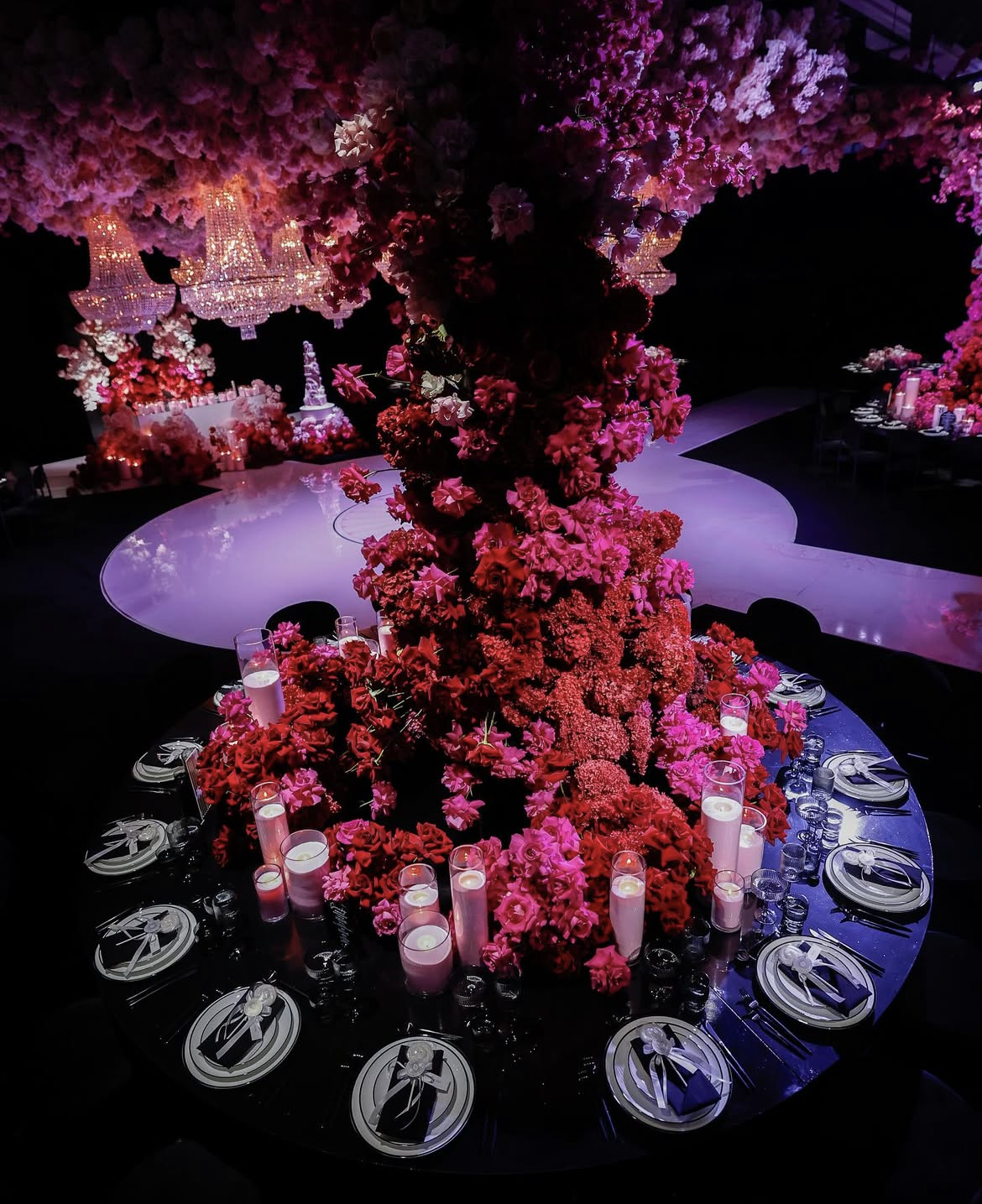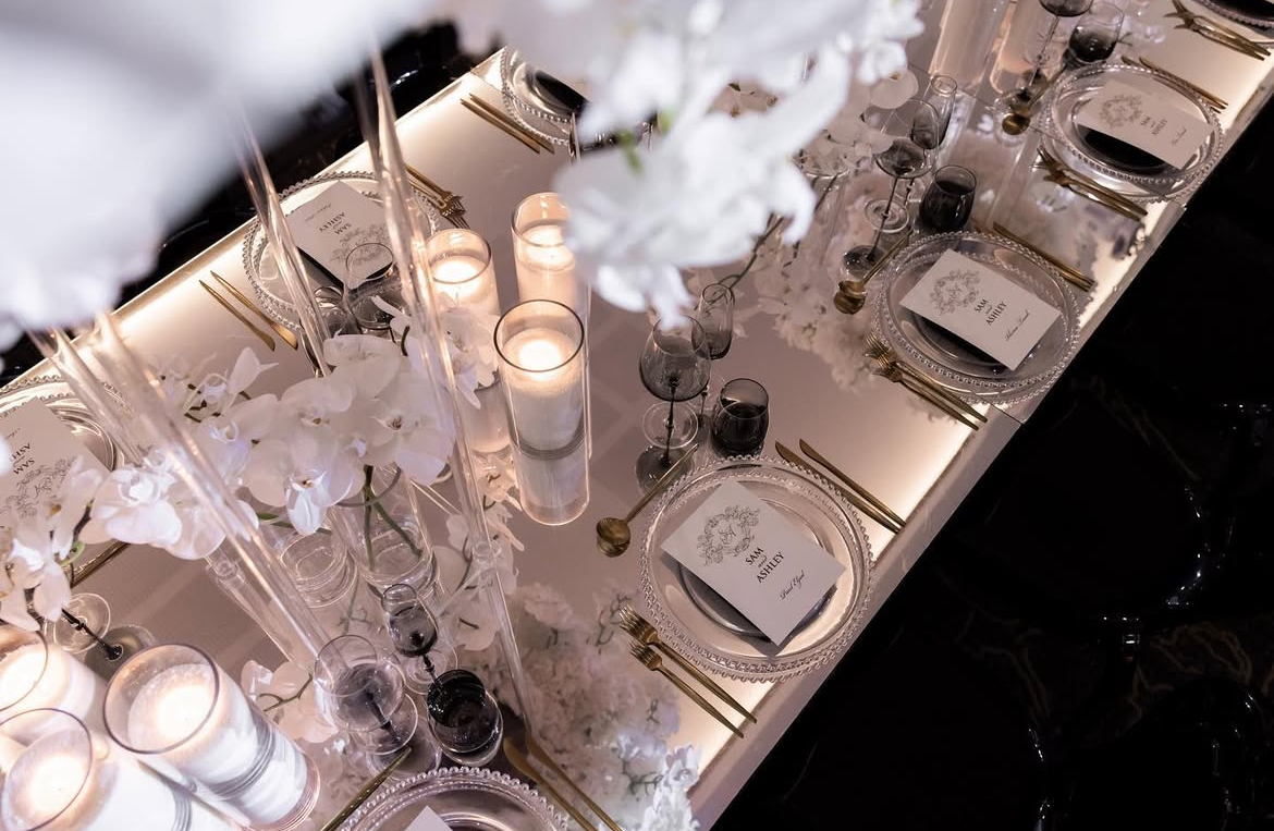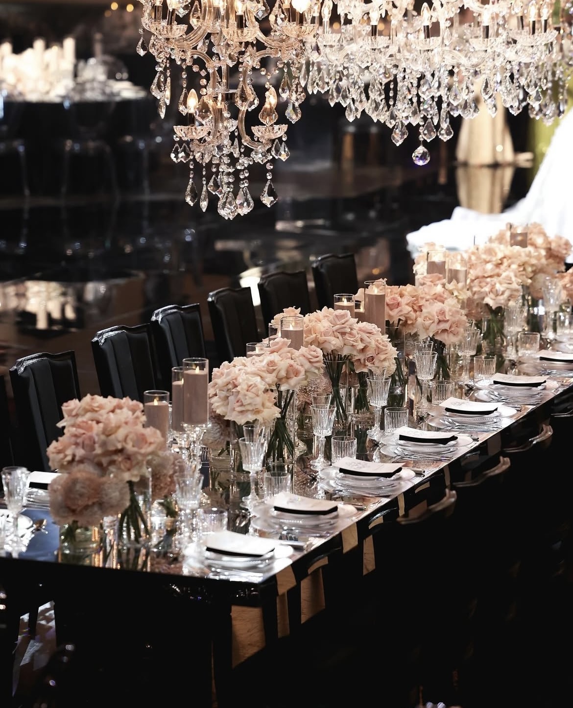 Expect glittering crystal chandeliers, ornate candelabras, and lavish floral arrangements in full bloom. Statement tables with mirrored or bold finishes are styled to perfection with elegant charger plates, sparkling cutlery, and crystal-cut glassware, creating a visually striking tablescape.