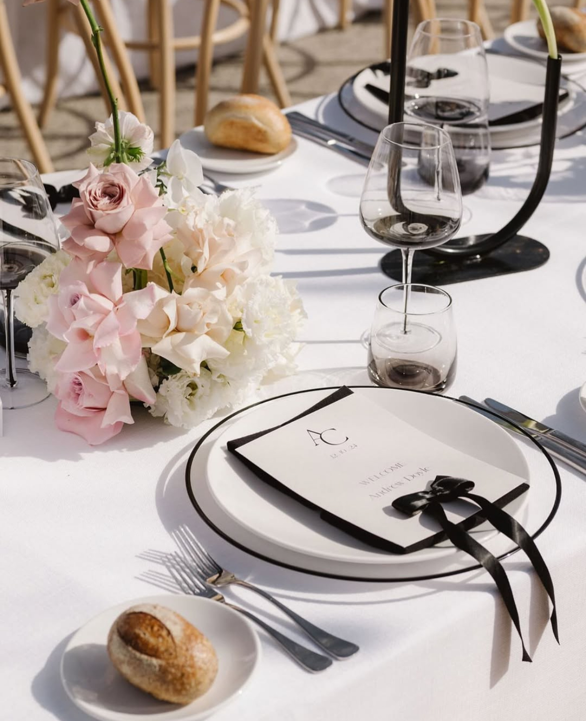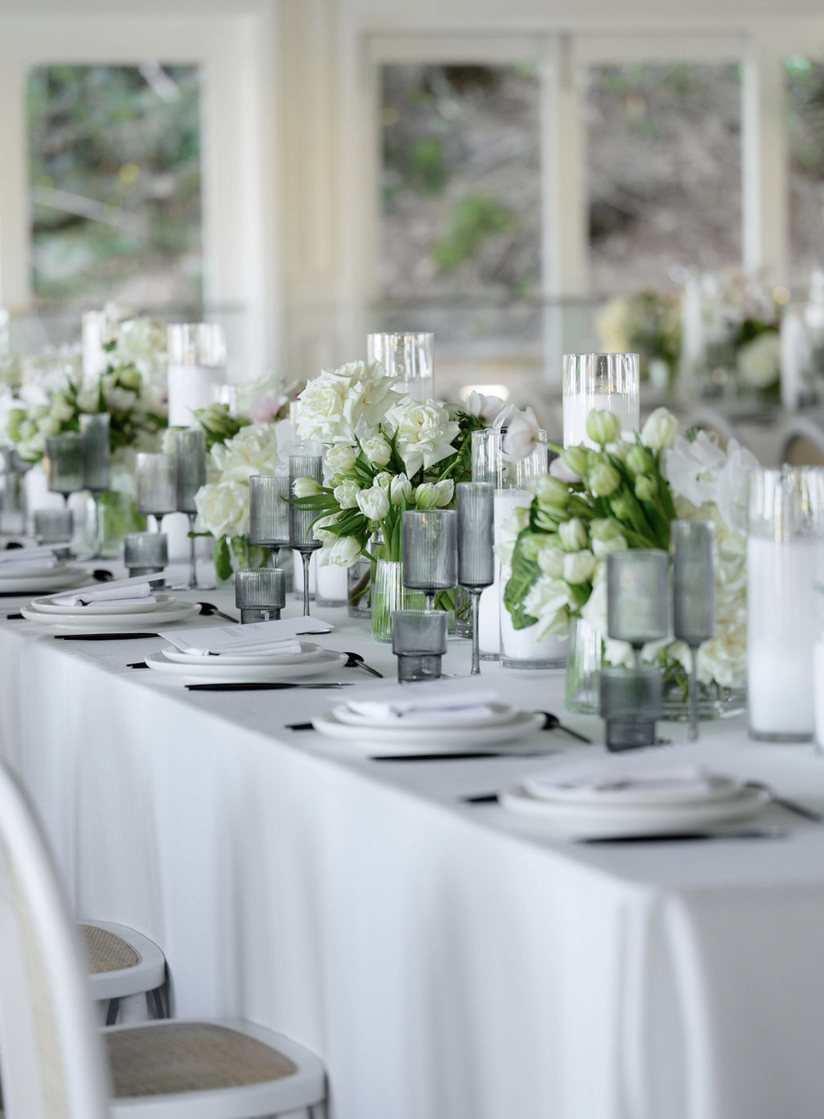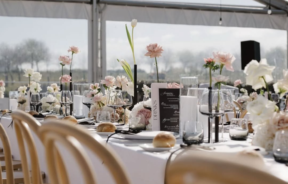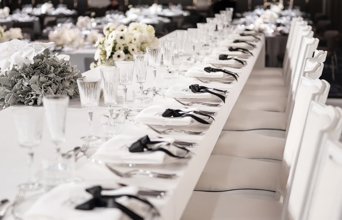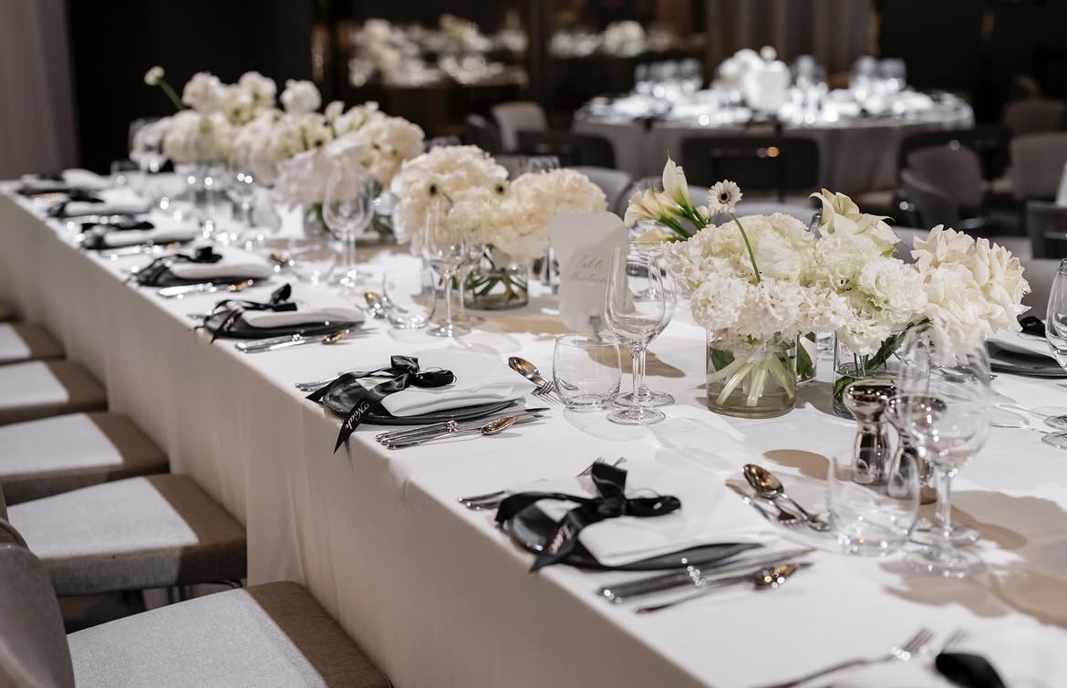 Tablescapes often feature crisp white linens, minimalist floral centrepieces and sleek modern tableware that complement rather than clutter.