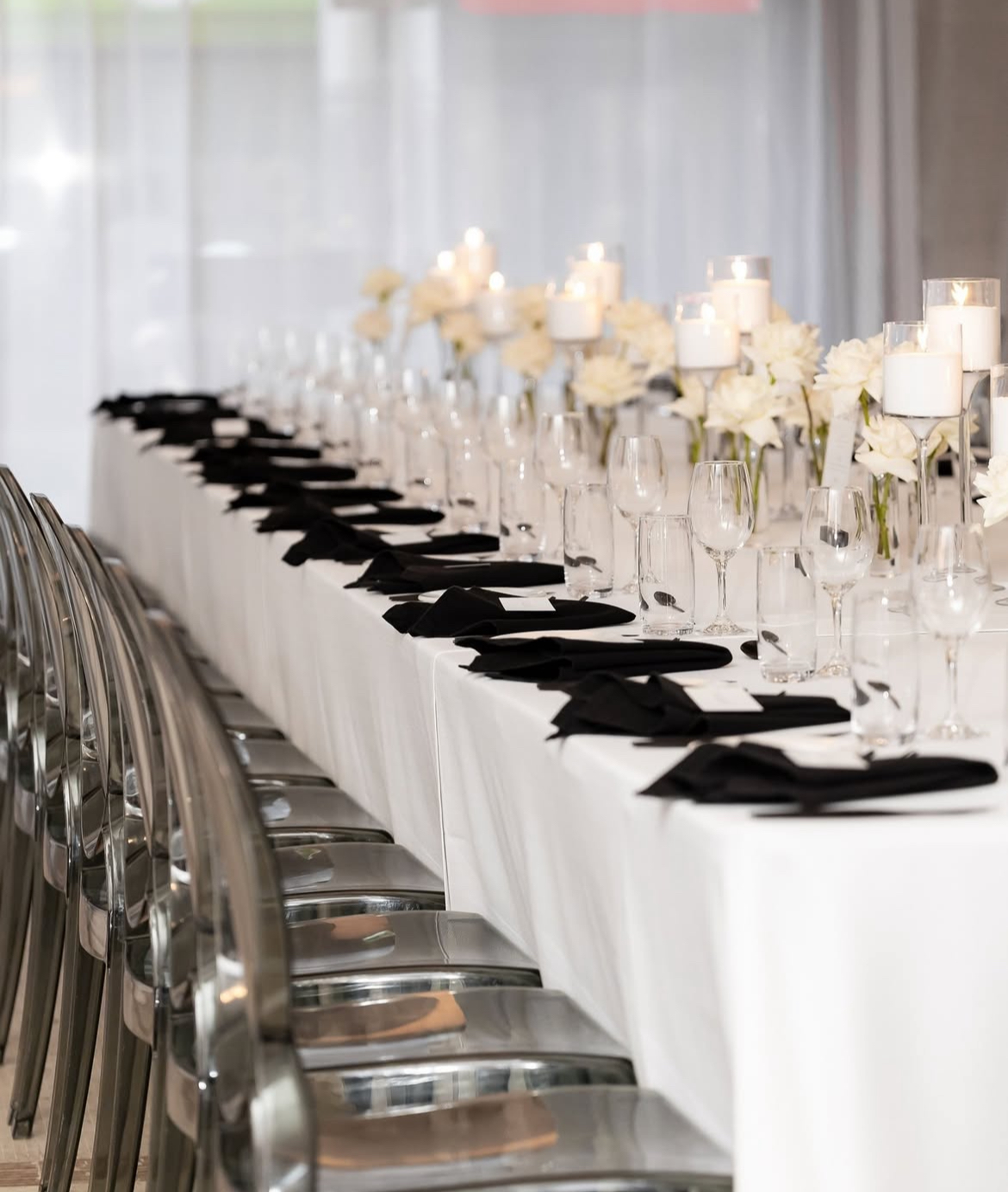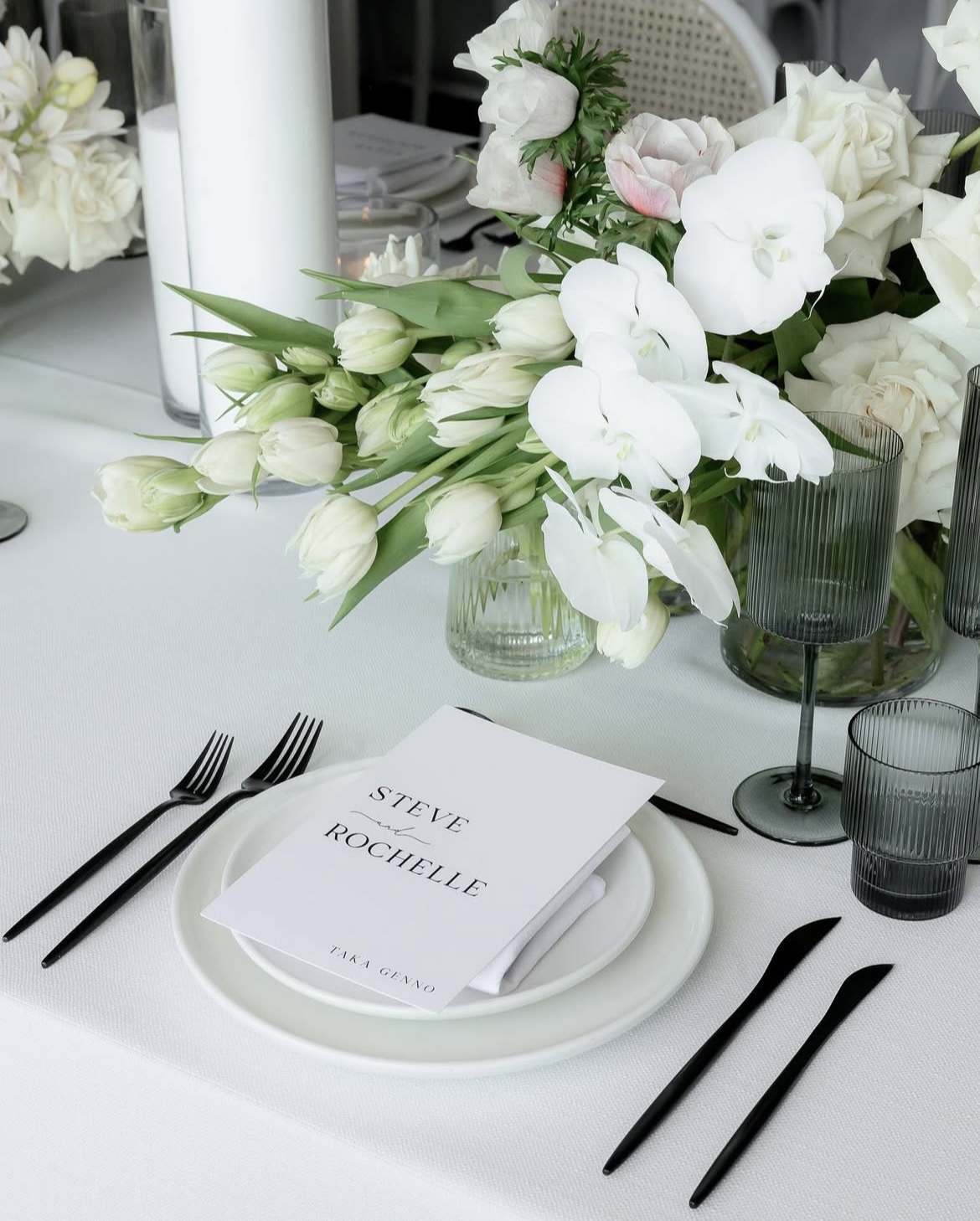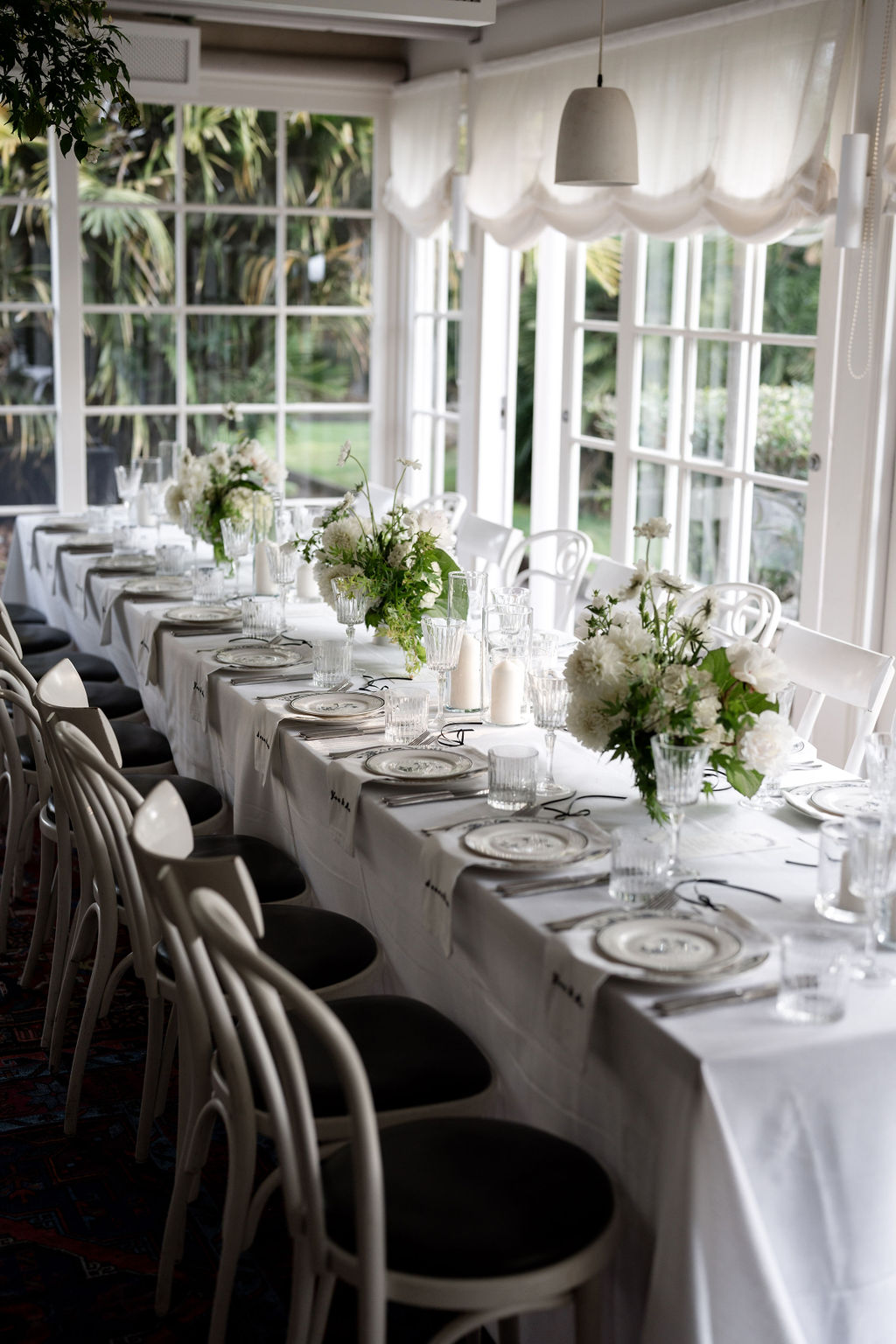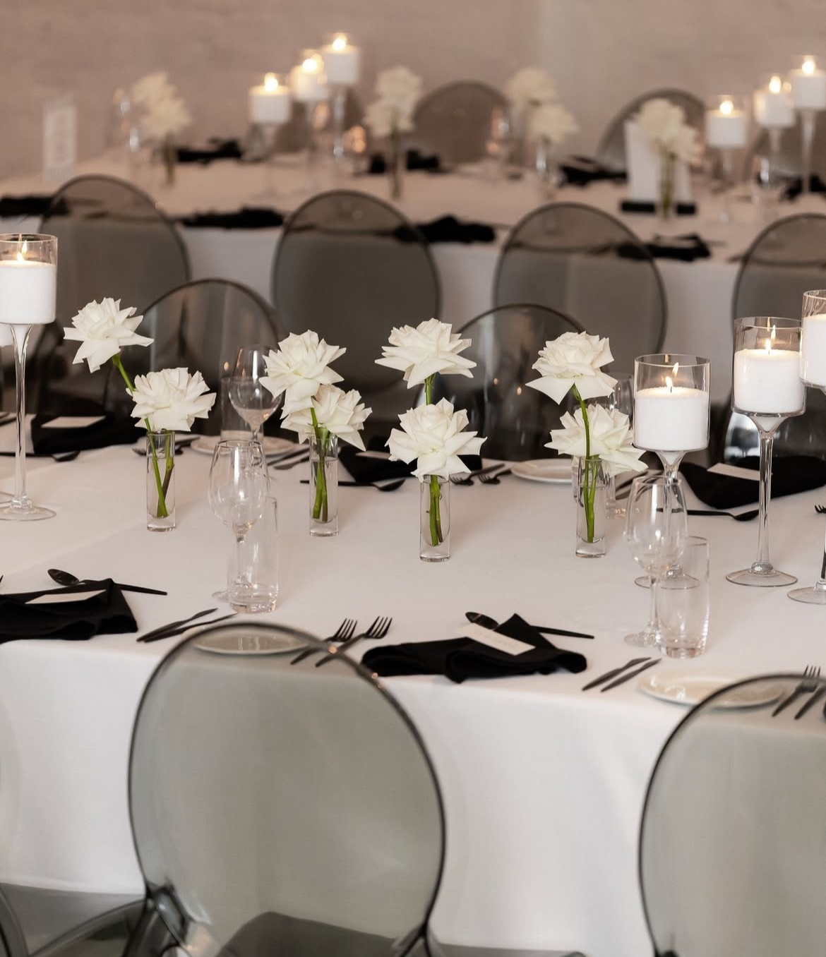 Tablescapes often feature crisp white linens, minimalist floral centrepieces and sleek modern tableware that complement rather than clutter.