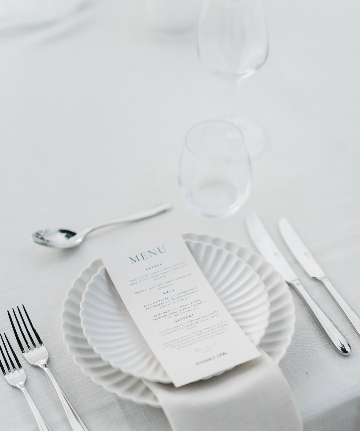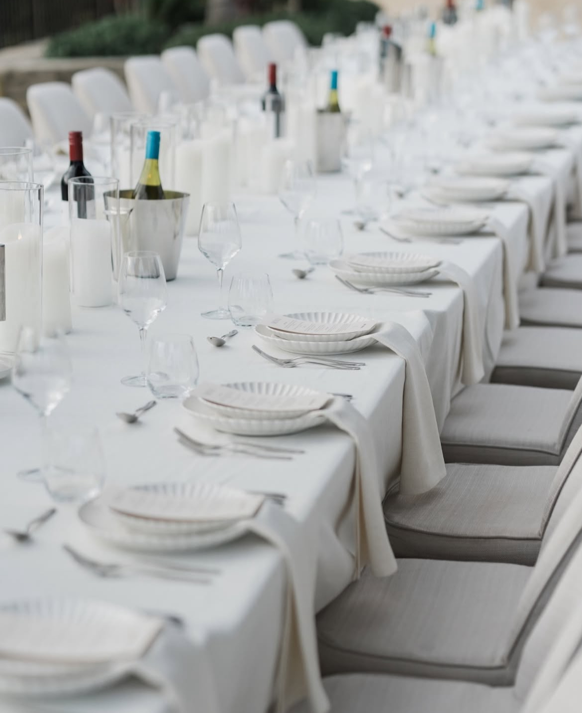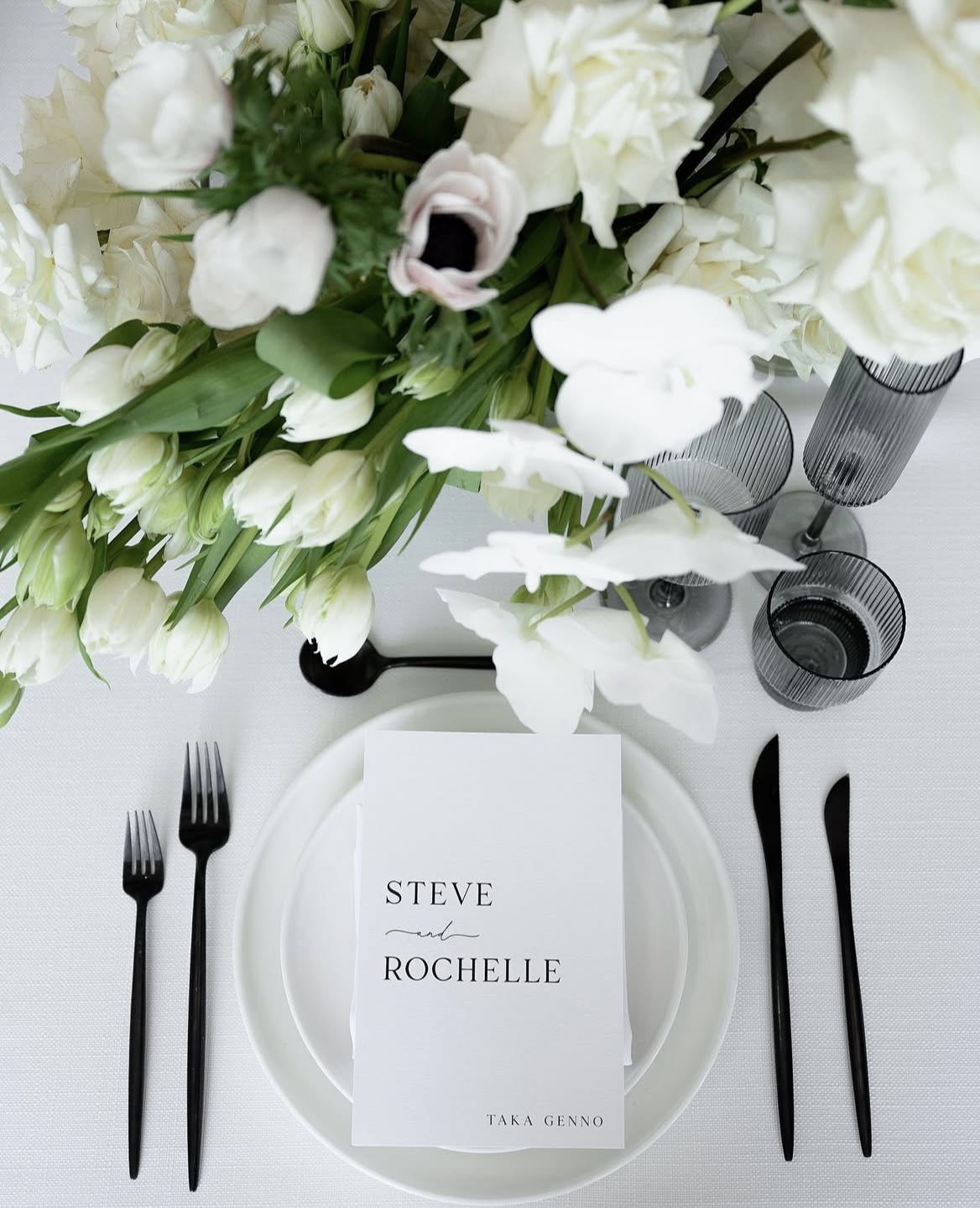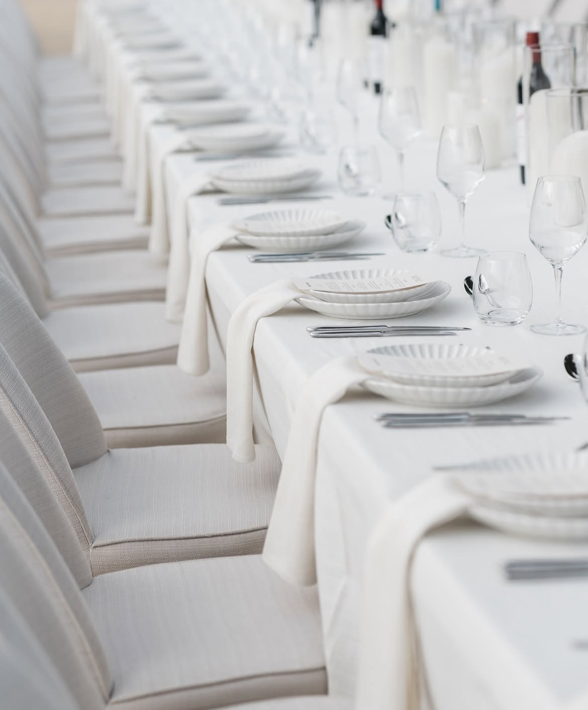 Tablescapes often feature crisp white linens, minimalist floral centrepieces and sleek modern tableware that complement rather than clutter.
